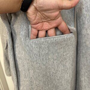 Soft grey herringbone, single button closure. Felt feel with back slit, lapel collar, fully lined. Shell is 100% cotton, poly lining.
