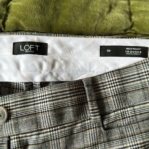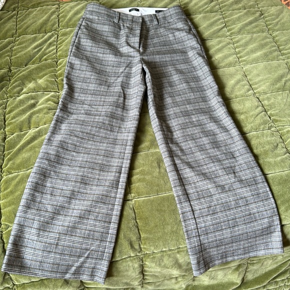 High waist trouser, polyester and viscose. Light grey plaid with camel and blue.