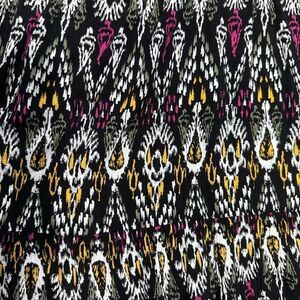 This flowy and fluttery tiered dress features a split neck with standing collar and ties. Cap raglan sleeves. Lovely abstract Ikat pattern. 100% Rayon. Measurements in pictures.