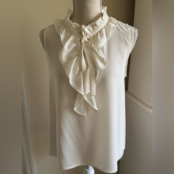 NWT Loft ivory ruffle shell top, size MP. Sleeveless, tie neck. Front 100% polyester, back 100% rayon. Machine wash cold, cool iron.