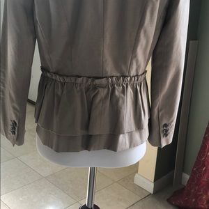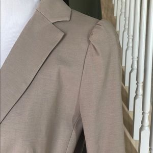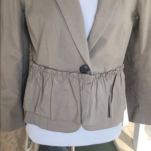 Very neutral colored jacket & versatile.It has a single button & buttons on cuffs,one ruffle all for added interest.Ive Worn this w/pink,purple,brown,blue all of which have matched.You can do it w/a pencil skirt or jeans...very lightly worn...Smoke free home.