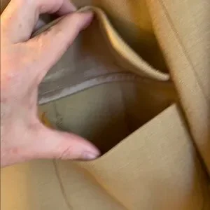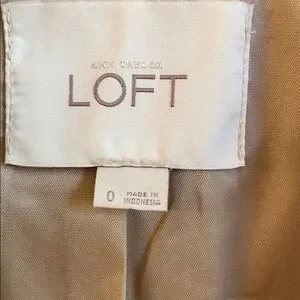 Fully lines Loft jacket. Camel color. Flap pockets on front that work. Button front close. Nice collar with just the right lapel Nice detailing in back of jacket.
