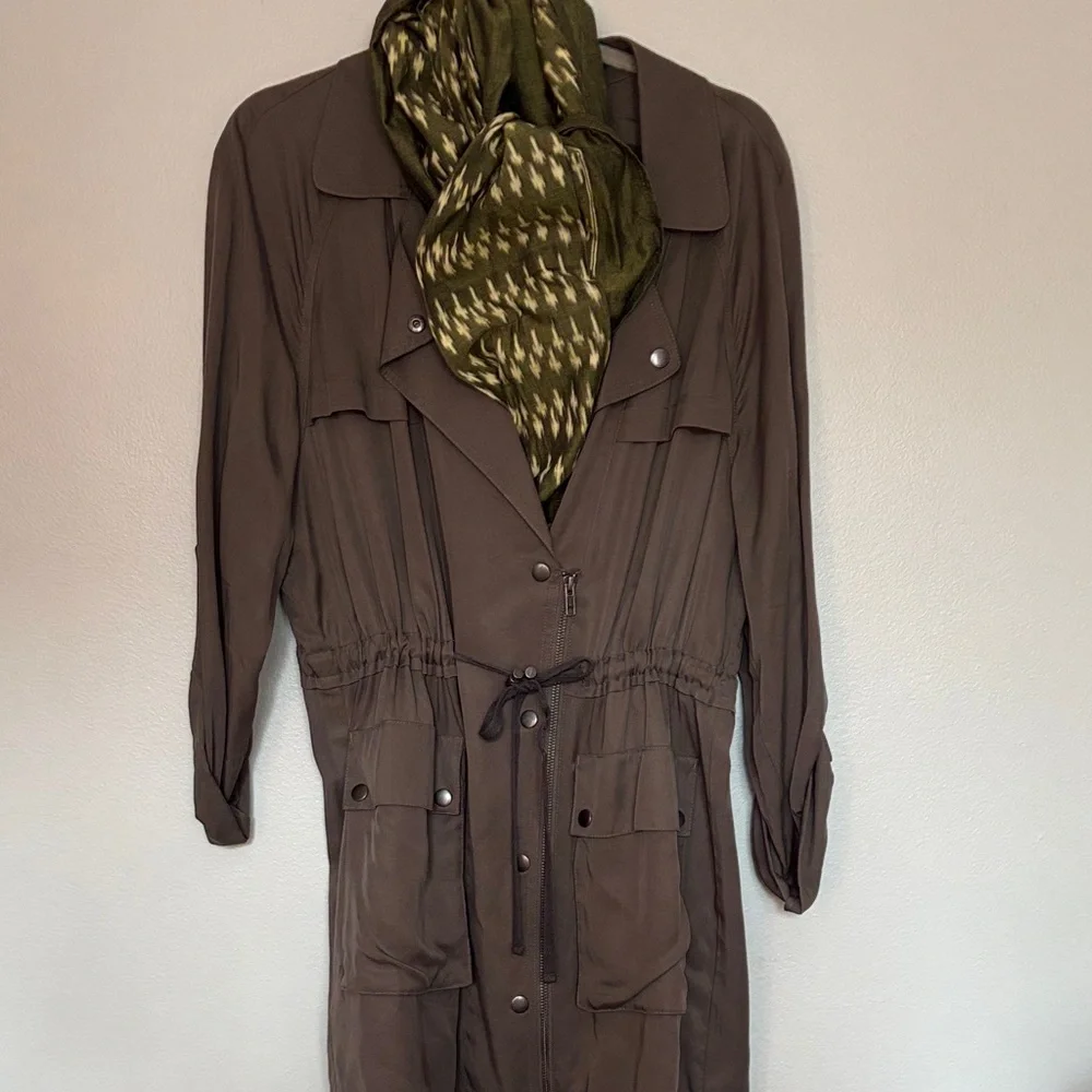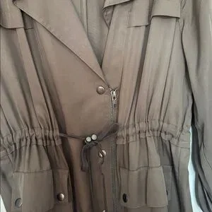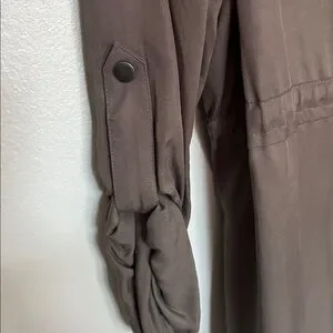 Loft casual jacket Olive green Roll up sleeves Cinch waist Snap and zipper closure About 33 in from shoulder About 21 in PTP Size large Loose fit Great lightweight jacket to wear now! (Scarf not included)