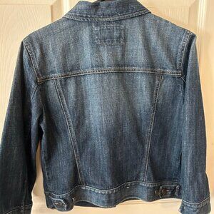 Elevate your casual wardrobe with this classic Loft Jean Jacket in Size 6. Crafted from a high-quality denim blend, this jacket boasts a versatile medium blue wash with a subtle fade that adds character. Its traditional design features a pointed collar, button-up front, flap pockets at the chest, and sleek side welt pockets for your convenience. The jacket is accentuated with contrasting tan stitching and silver-tone hardware, providing both chic style and durability. Perfect to layer over your favorite dress or pair with a t-shirt and jeans, this jean jacket is a must-have staple for any fashion-conscious individual looking to combine comfort with an effortlessly stylish look.