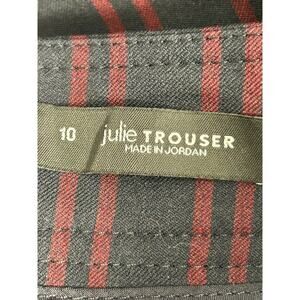 The Loft Julie Trouser is a pair of size 10 red striped pants with a straight leg silhouette and a sailor high rise design, ideal for a career wardrobe. Featuring a button accent and a flat front, these dress pants are crafted from a blend of polyester, spandex, and rayon for comfort and stretch. Perfect for the summer, fall, and spring seasons, these pants are machine washable and suitable for travel, casual, and business occasions. Made in Jordan, they have a city theme and are designed for women looking for a stylish and professional look.