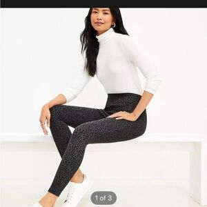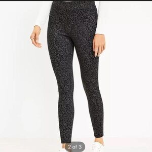These LOFT leggings feature a chic black base adorned with a subtle speckled pattern, offering a stylish twist on classic leggings. Designed with a high-waisted fit, they provide a flattering silhouette and comfort with their stretchy fabric. Perfect for both casual outings and dressier occasions, these leggings are a versatile addition to any wardrobe.