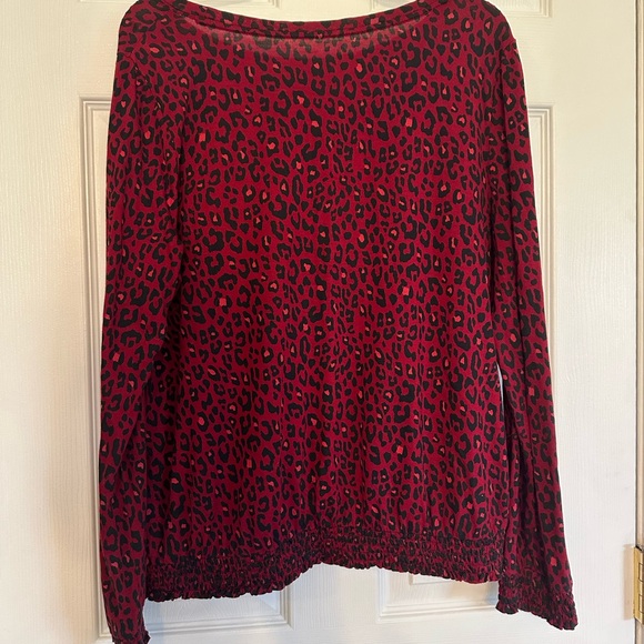 Chic red and black leopard print blouse with a ruched sleeve and base. Perfect for casual occasions or dressed up with a blazer and heels!