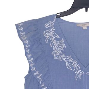 Fresh, feminine, and effortlessly chic — this LOFT blue chambray blouse features delicate white floral embroidery and soft flutter sleeves with ruffle detailing. The flattering V-neckline and relaxed peplum hem make it a perfect choice for warm-weather style or layering year-round.