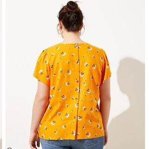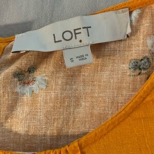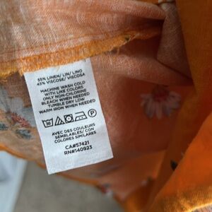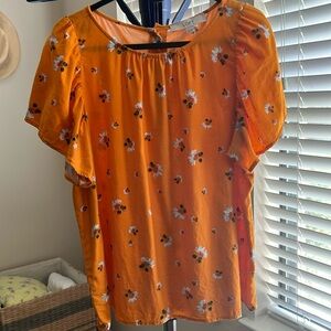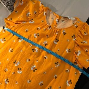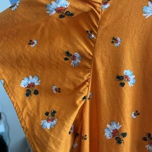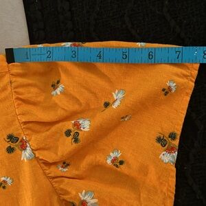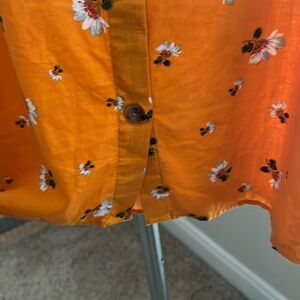 Cute floral shirt that is perfect for the spring and summer! Cool and lightweight with a linen blend material. Machine Washable. Buttoned back. Fluttery flounce sleeves. Mustard yellow color that has an orange hue.