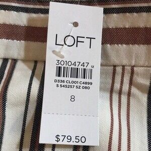 Ladies lined white stripe skirt by Loft. New with tags. Size 8. Waist measures 32" - Length 33". Body is 98% rayon - 2% other fiber. Lining is 100% polyester. Comes from smoke free home.