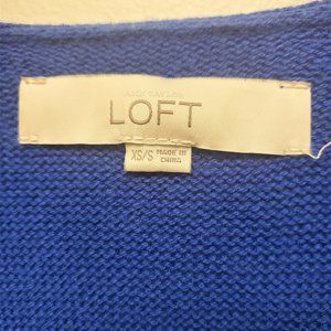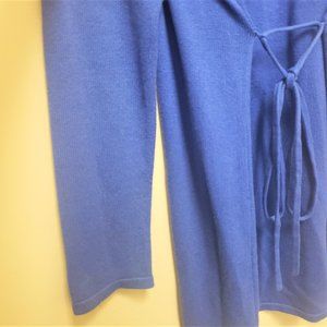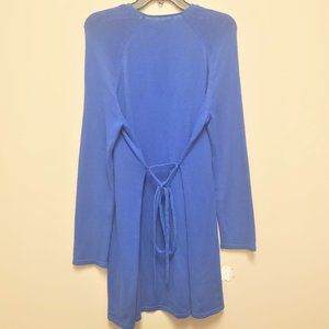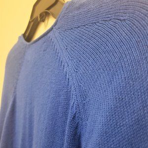 This comfortable Knit sweater has been worn a few times. It is entirely blue in color and is long sleeved. The material is also incredible soft. It is 35 inches long.