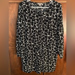 Loft Long Sleeve Romper with Leaf Pattern. Hidden button front and drawstring tie waist closure. Size 4P. Buttons at wrist cuff can be rolled and tied to button at elbow for a rolled sleeve look.