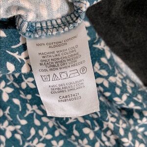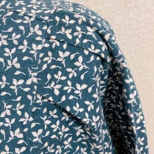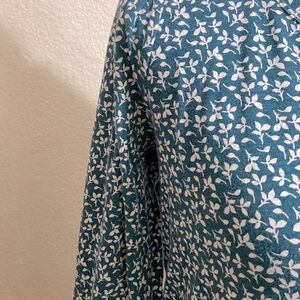 Stylish teal top with white floral pattern. Made from 100% cotton for comfort.