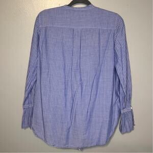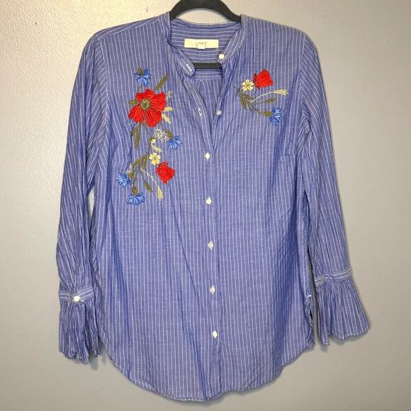 Loft M Button Blue Shirt Floral Embroidered Stripe Chambray Flaired Long Sleeve