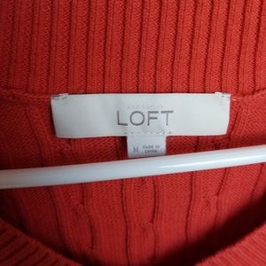 This is an orange, medium sweater from Loft. It is cable knit and in great condition