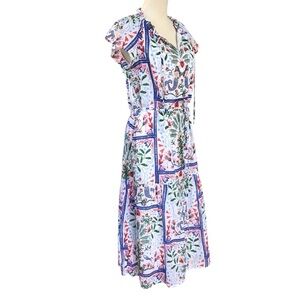 This Loft Mermaid Garden Cotton Midi Dress in women's size petite small features a beautiful mermaid floral garden pattern, short sleeves, and a tie neck neckline. Made from lightweight cotton fabric, this dress is perfect for travel, parties, or casual occasions during the summer, fall, or spring seasons. It comes in a vibrant multicolor design with ties on the waist for a stylish accent. Easy to care for with machine washable instructions, this dress is a perfect addition to any woman's wardrobe who loves a beach-inspired theme with a touch of floral elegance. Length: 48” Pit to pit: 19.5” Measurements are approx and taken laying flat Excellent pre-owned condition B149