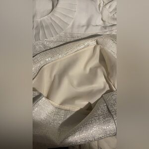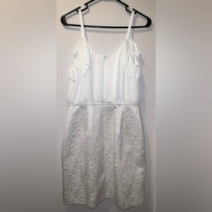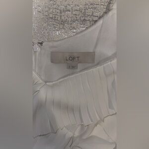 Loft dress size 6. Never worn. Beautiful silver threaded taffeta on the bottom, with white chiffon on top. The inside of skirted area is lined. Pit to pit 18.5 inches, length 37.5 inches. I am 5’6 and it hits just above the knee on me. Small spot on back near top of zipper, can be seen in photo.