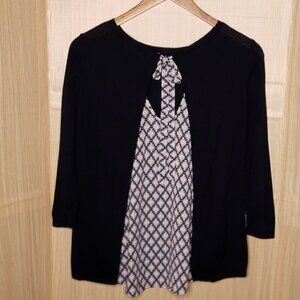 Loft navy lightweight sweater with silky fabric back and tie. Perfect with jeans or dressed up for work. Gently used. Measurements are 19" from armpit to armpit, 20 1/2" sleeve, 25 1/2" from shoulder to front hem, and 16" from armpit to hem.