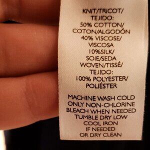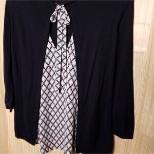 Loft navy lightweight sweater with silky fabric back and tie. Perfect with jeans or dressed up for work. Gently used. Measurements are 19" from armpit to armpit, 20 1/2" sleeve, 25 1/2" from shoulder to front hem, and 16" from armpit to hem.