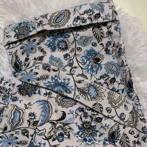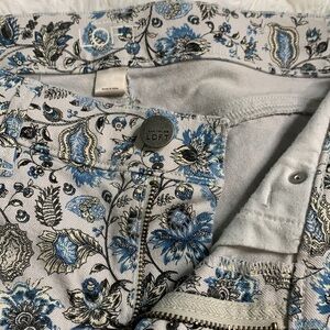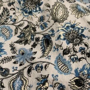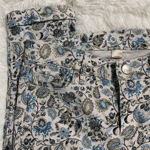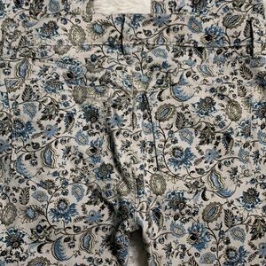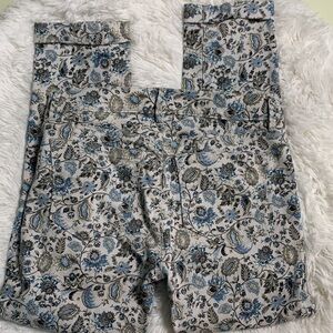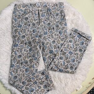 Gorgeous pants by Loft! Light gray backing with a gray, black, and blue floral paisley pattern. Stretch jean fabric that looks polished enough for the office, but with the comfort of your favorite blue jeans! Lower mid rise with cropped length with bottom cuff. Classic five pocket design with belt loops. Great patterned pants! Fabric tag has been removed, but they're 98% cotton/ 2% spandex.