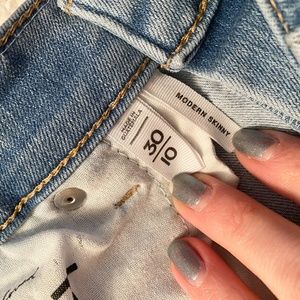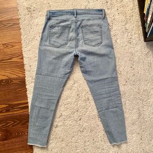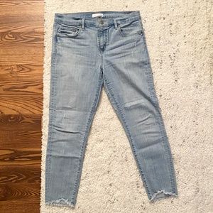 Like new condition Loft jeans in modern skinny light wash, hit right above the ankle. Trendy but modest rips around the ankles. Size 10, fit true to size.