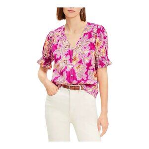 Loft Mosaic Puff Sleeve V-Neck Mixed Media Top XL Pink Tropical 100% Cotton