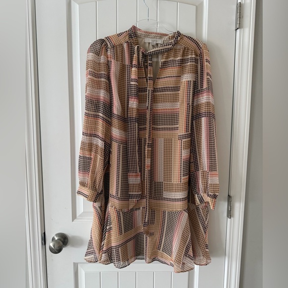 Elegant dress featuring a houndstooth pattern. Accented with pink and brown tones. From the Loft.
