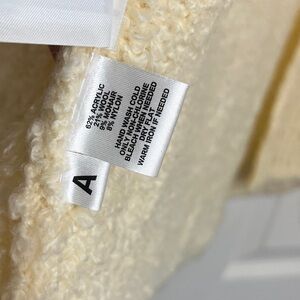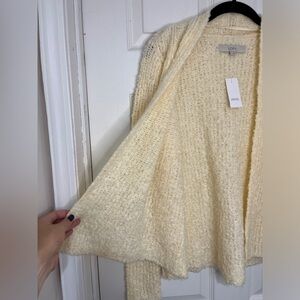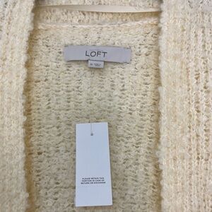 Soft and fuzzy Boucle knit open front cream cardigan by Loft. Drapes beautifully while providing warmth and comfort. Mohair and wool blends in fabric add to the appeal. No flaws. NWT.
