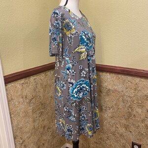 Loft NWT Outlet Size Medium Stretchy Dress, Gray Teal Yellow Flowers, Floral, New With Tags. Underarm to underarm measures approx 17.5” across. Mid-shoulder to hem measures approx 35” long. This pretty and stretchy dress is comfortable all day!