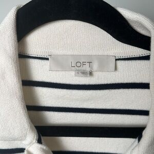 This LOFT cardigan sweater features a timeless navy and white striped design, perfect for layering. Crafted from a comfortable knit material, it offers a versatile style suitable for casual wear.