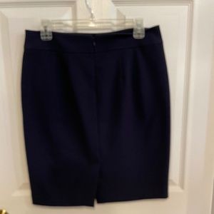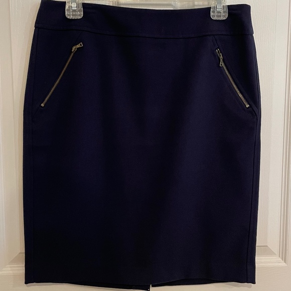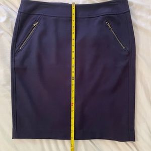 Classic with modern twist navy pencil skirt. Front zipper detail. Polyester-rayon blend size 8. Unlined. Like new condition. Some pics looks grey, but definitely navy in color.