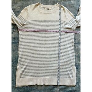 Off white long sweater from Loft with a blue tinted gray stripe pattern. Crew neckline, ribbed knit cuffs and hem. 6.5 inch slit on each side.