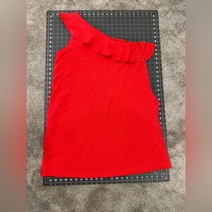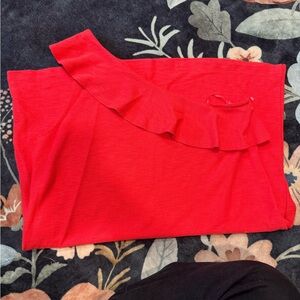 Stylish red orange one-shoulder dress with ruffle detail. Perfect for a chic look. Hits mid thigh.