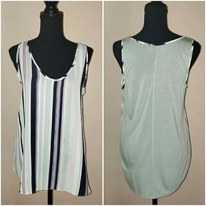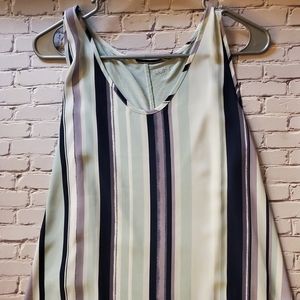 This nice dressy casual top can be worn with jeans or slacks. The front has a mix blend of colors, navy blue, light purple, off white, light sage green and dark purple. The back of the shirt is light sage green has a cotton feel and the front has a polyester feel. The shirt is see through.