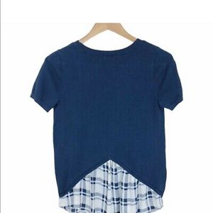 Loft Outley Short Sleeve Navy Blue Sweater with Plaid Ruffle Hem. Throw it on with jeans and go for an instant causal but put together outfit. 100% cotton and super comfortable.