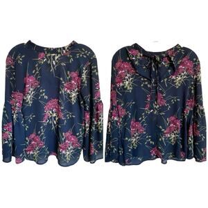 Loft Outlet Petite Blue/Plum/Green Floral Neck-Tie Top Bell Sleeves - SP