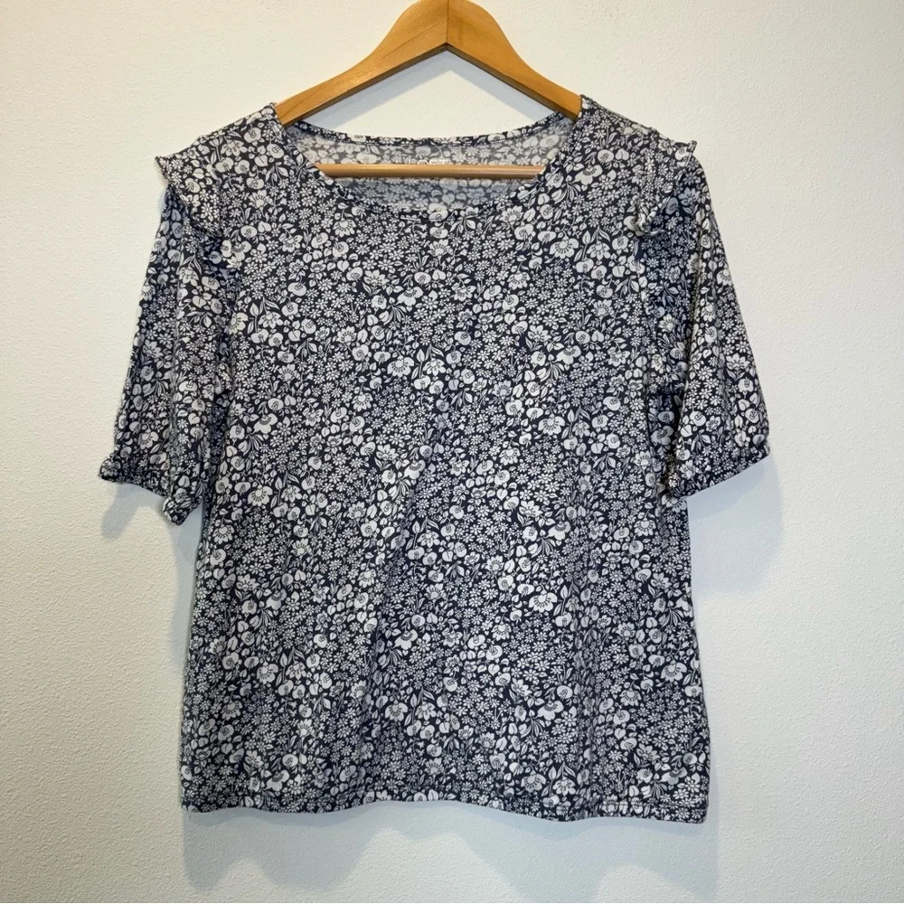 GUC No damage or stains Slight bubble sleeve Elbow length sleeve Ruffle detail on shoulders Blue/grey and white