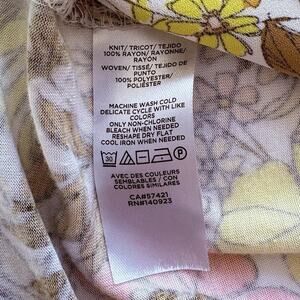 This is a stylish women's short sleeve casual shirt from Loft Outlet in size XL, featuring a floral pattern with a 70s retro vibe. The blouse has a round neck, pullover closure, and is made from a blend of polyester and rayon. Perfect for casual occasions in the summer, fall, or spring, this lightweight and easy-care garment offers a colorful and comfortable look with a regular fit. The front of the shirt is 100% polyester and the back is 100% rayon. The chest measures 46 inches and the length is 26 inches. The vibrant multicolor design and flutter sleeve type make this blouse a versatile and eye-catching addition to any wardrobe.