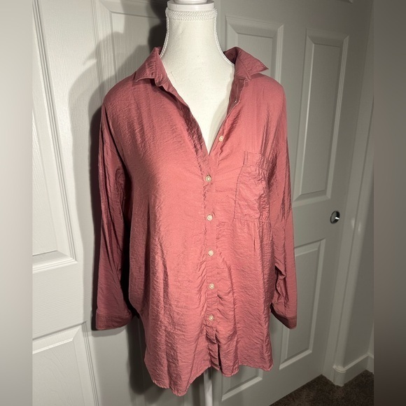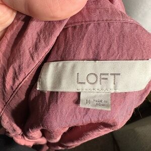 This is a cute top from loft. I wore it unbuttoned with a white tank under a lot. I still have a blue one. It does have a slight texture to it. I can iron the shirt but it falls like this pretty fast
