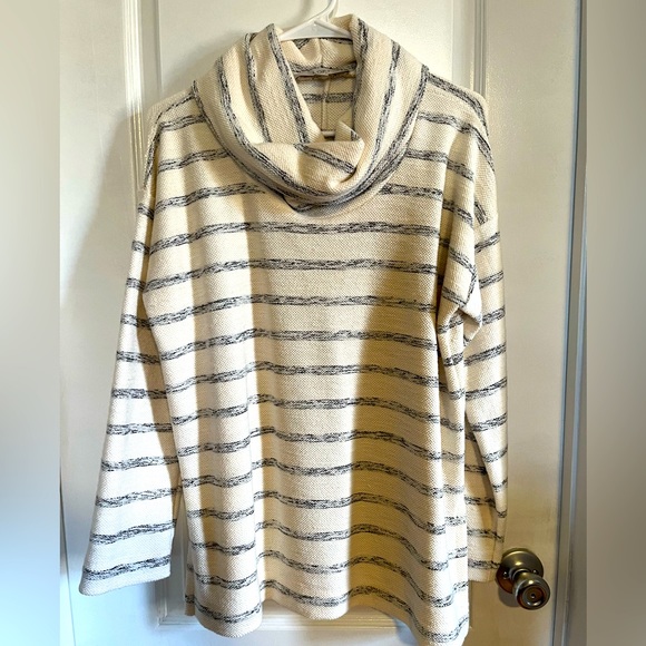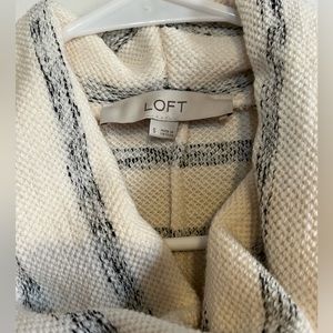 Loft white with grey stripes tunic top. Between a sweater and sweatshirt material. It’s nice and thick and long enough to wear with leggings. Slightly oversized