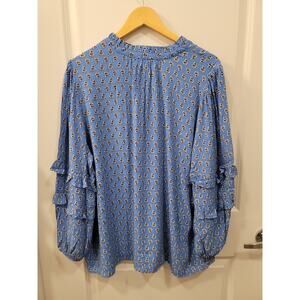 Light blue blouse features all over black and paisley print, a standing collar, functional front button placket closure. Long sleeves with tiered ruffle detail, puff shoulders and elasticized cuffs.