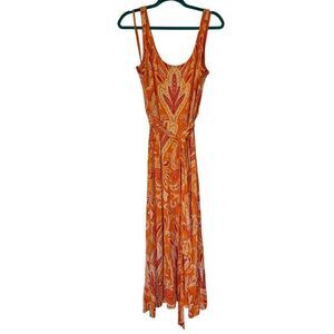 Loft Paisley Tie Waist Midi Dress Sleeveless Calypso Orange, Spring Beachy | L | EUC | MSRP $98 | *Flaw, possible discoloration lower front of dress Please refer to the photos for the condition | Measurements Laying Flat and Unstretched: Pit to pit 18.5" | Length 52"