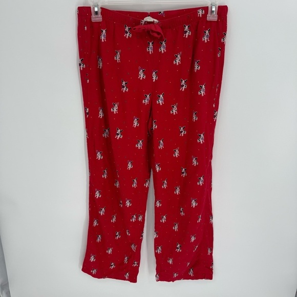 Loft Pajamas Red 2 piece set Woman’s Size M/L French Bulldogs Flannel. Top is a size large and bottoms are a size medium. Short sleeves. White piping. Cotton viscose. Green leaf and polka dots. Bust 40. Top length 25. Waist 32. Inseam 28. Measurements are approximate. Very good preowned condition.