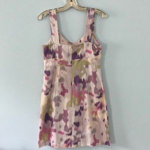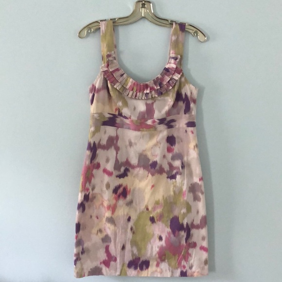 Loft patterned sundress. Size: 6. Color: cream, green, purple, pink. Ruffle detail at the neck, hidden zipper at the back. 100% cotton, machine wash and tumble dry low. Super cute and breathable for summer!