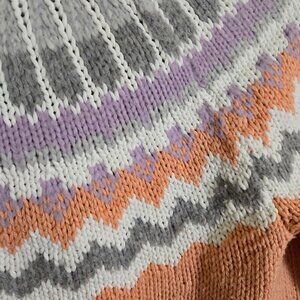 Loft Peach Lavender Fair Isle Wool Blend Sweater, Size M. Pit to pit 21", shoulder to hem 25", Stunning Peach Sweater with Gray, White, Lavender Fair Isle Design. Cotton/ Viscose/ Wool/ Mohair Blend.