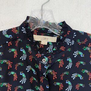Loft Peacock Print Ruffle Neck Blouse Button Up Long Sleeve Navy Blue Size M