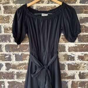 Every closet needs a touch of romance and this off the shoulder dress, equal parts flattering and flirty, is just the ticket. Elasticized off the shoulder neck. Blouson half sleeves with elasticized cuffs. Elasticized tie waist.