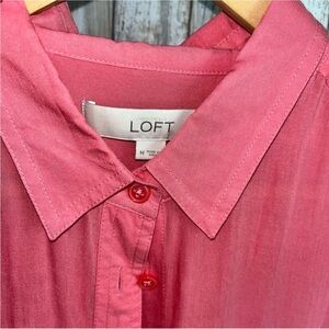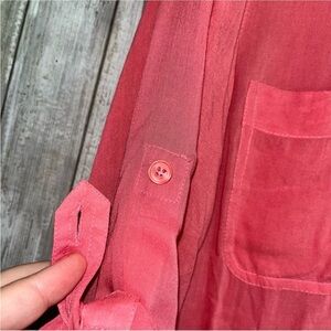 Stylish coral sheer blouse with button-up front and chest pockets. Perfect for layering.