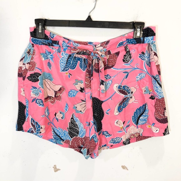 Loft shorts. Pink printed material. Ties at waistband with side pockets. High rise waistband.