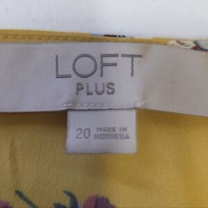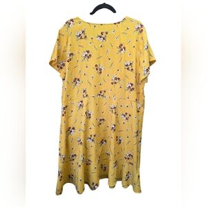 Loft plus dress in a golden mustard yellow floral print. Flowy, high waist, button front. Ruffle hem, and short sleeves.